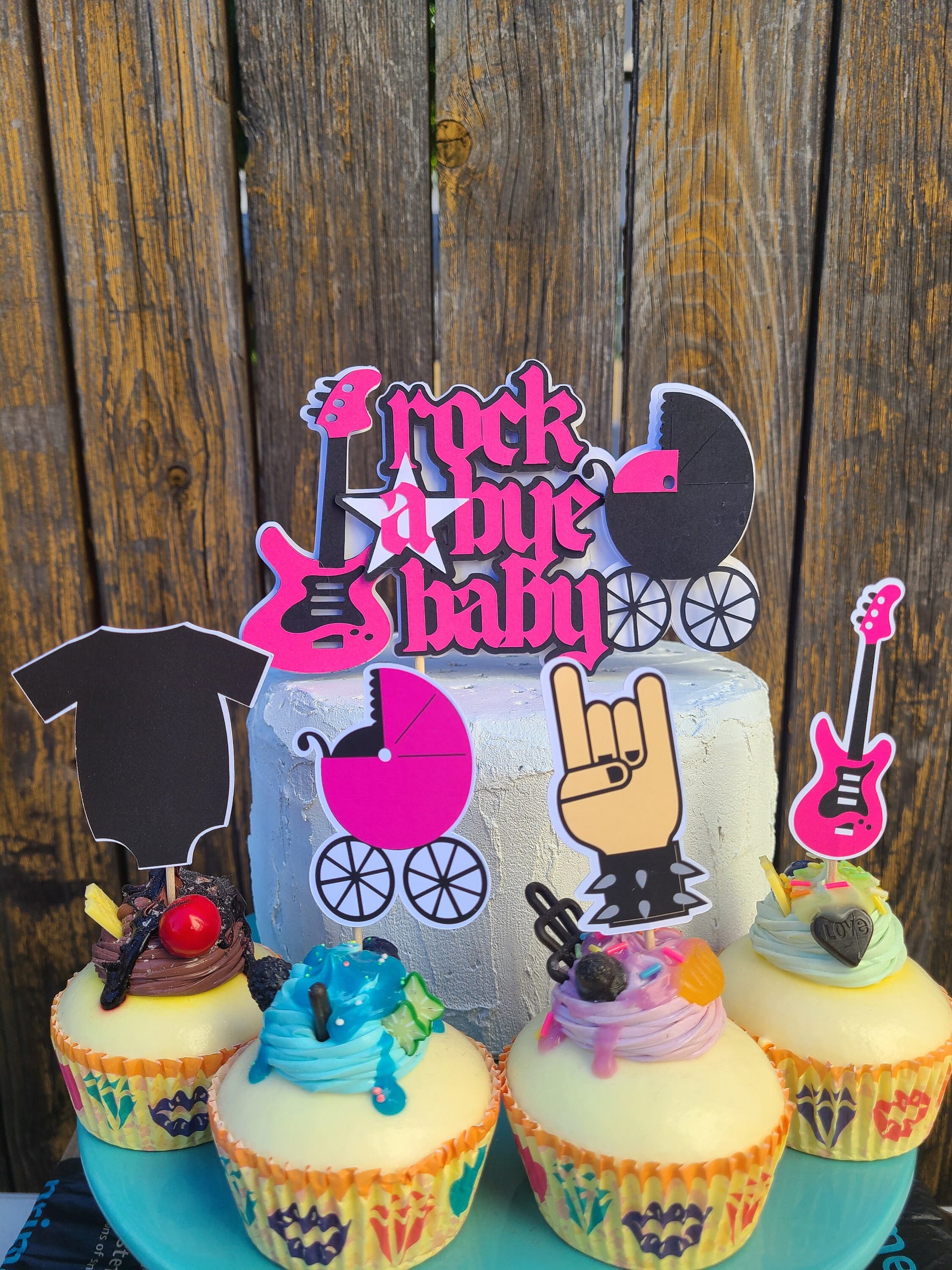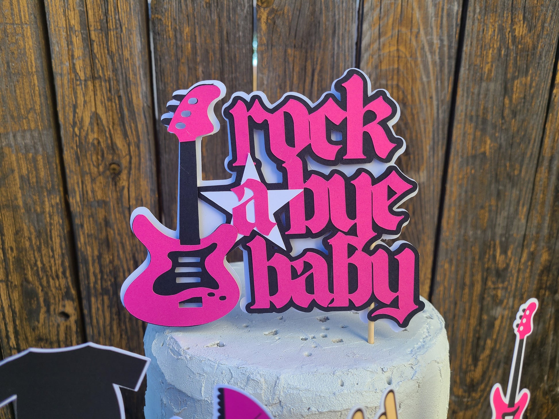 Package includes Rock a Bye Baby banner, 1 dz cupcake toppers, 1-4pc cutout set, and the guitar/stroller cake topper